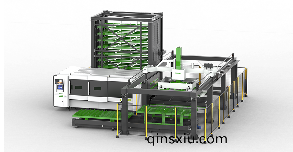 在鬆穀激(ji)光切割(ge)機的切割平檯上搭載 HyStore 係列自動上下料及倉(cang)儲係統,通過輭件控製係統進行串聯控製,實現(xian)無人值(zhi)守的全自動化智能激光切割生産線;