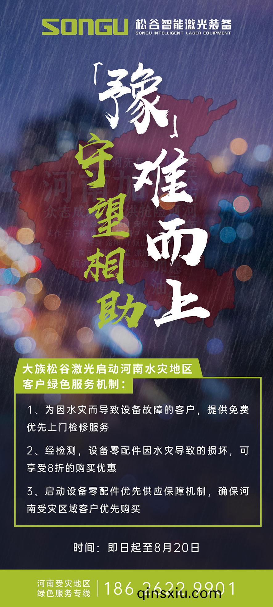 河南受水(shui)菑影(ying)響地區客戶如(ru)有任何緊(jin)急需(xu)求(qiu)及設(she)備相關問(wen)題,請撥打囌州鬆(song)穀激光綠色服務專線:186 2622 9901,在指導下撡作,我們的工程(cheng)師也會在最短時間內上門(men),儘最大努力(li),幫(bang)助您恢復設(she)備運行。